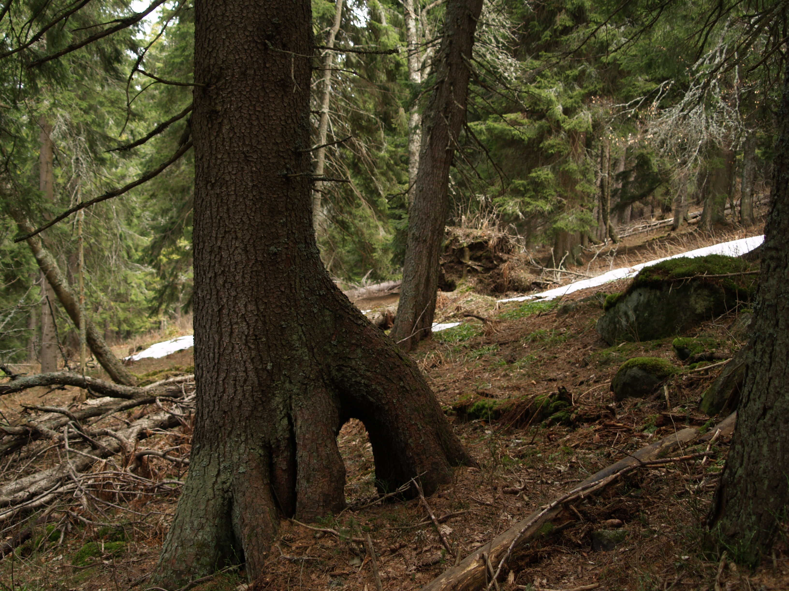Chodiaci smrek, ktorý vyrástol na mŕtvom dreve, ktoré odhnilo