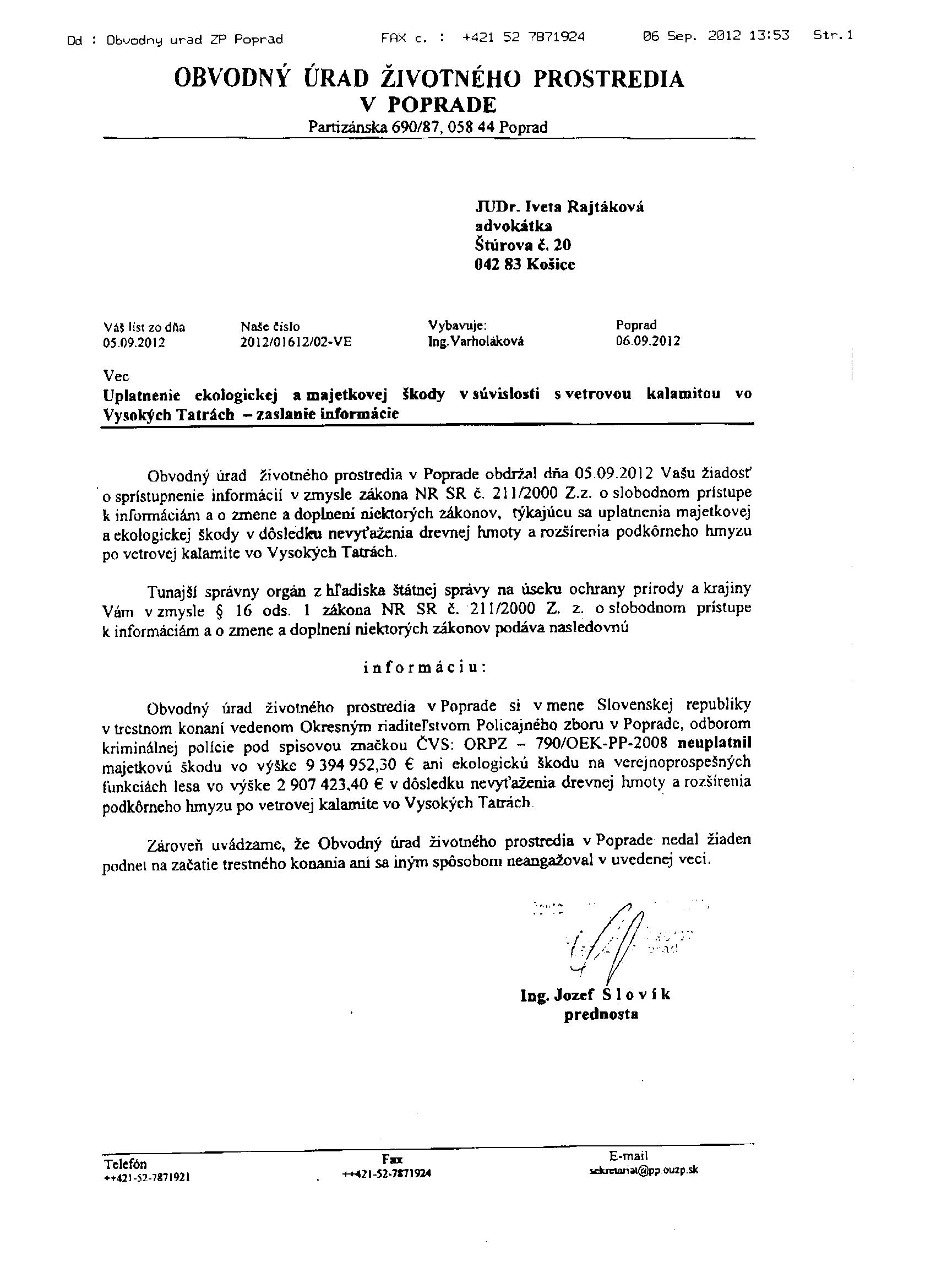 - Obvodný úrad životného prostredia v Poprade – Uplatnenie ekologickej a majetkovej škody... 6. 9. 2012